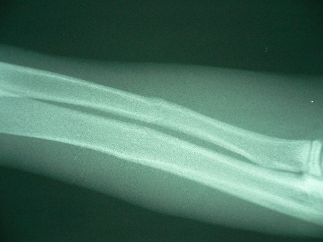 やんちゃ盛りの「いん」は、他の仲間と大騒ぎの毎日です。この度、仲間と遊んでいる最中に腰の高さから落ちたそうです。それ以降、足を痛そうにしているとの主訴で来院されました。病院で早速レントゲンを撮影すると、右の写真の通り、右前肢2本(前肢は、二本の骨で構成されます)の骨折が見られました!みずみずしい木の枝を折ったときの様相を呈するこの不完全骨折を「若木骨折」と呼びます。