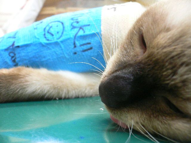 やんちゃな成長期であり、飼い主さんも安静に自信が持てないため、数週間骨折部を保護するギブス固定を行いました。いつも私は、早く傷が治るようにサインをしますが、これに効果があるかどうかはわかりません?多くの飼い主さんに喜んでいただいている気がしていますが・・・・どうかな?Toshi