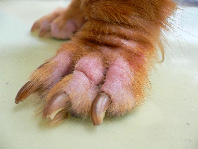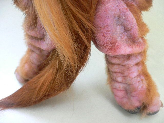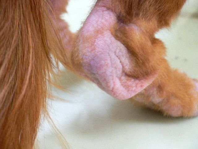 真っ赤になった上に、脱毛が著しく、歴史を物語る皮膚の皺が見られます。皮膚には著しい酵母感染が見られました、この症状は、2次的変化だと考えられます。痒みを表す病気には、疥癬(ダニ)、アレルギー(食物、アトピー)膿皮症、真菌症、マラセジア、蚤などが挙げられますが、それぞれを除外しながら治療を進めたいと思います。