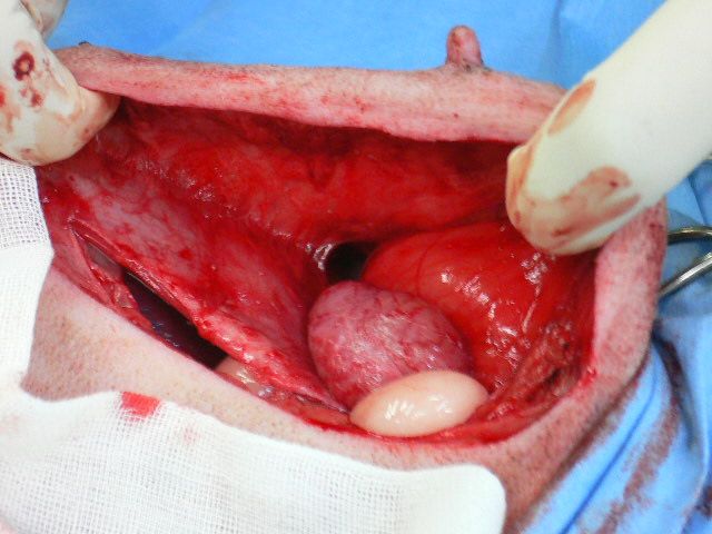 ヘルニア輪(穴)がかなり大きかった(約7cm)為に腹腔内の膀胱、大網が大量に飛び出していました。皮膚の切開を一か所にしたかったので、アプローチがとても大変になりました。白い真ん中の餅様の脂肪の上が飛び出した膀胱です。