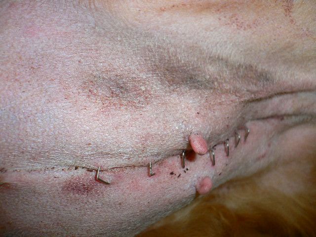 膨らんでいた穴がしっかりと塞がれ10日目、無事に抜糸に来られました。長きに渡りヘルニアで皮膚が膨らんでいたので、摩擦で皮膚の一部が変色しています。いずれこの色素沈着は、無くなると思います。毎年の定期的な身体検査では、毎回手術をお勧めしていましたが、このたび晴れて整復できたことで、飼い主さん、我々も安心することができました。めでたし、めでたし。
