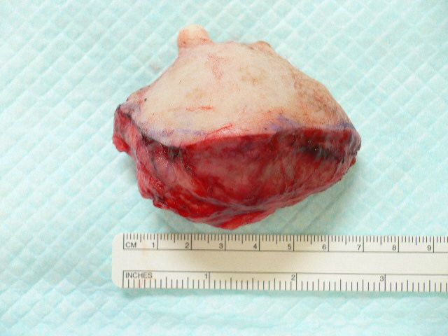 左の第5乳腺部分にこのような膨らみが見つかりました。飼い主さんは、ずいぶん前からご存じでしたが、そのままにしていたそうです。今回、子宮・卵巣摘出と同時に切除することをお勧めしました。この乳腺は、多くが水分で膨らみ、その中に、約1cmの腫瘤が発見されました。当然、病理検査へ提出し、悪性、良性、切除範囲の診断を行います。良性であることを願います。