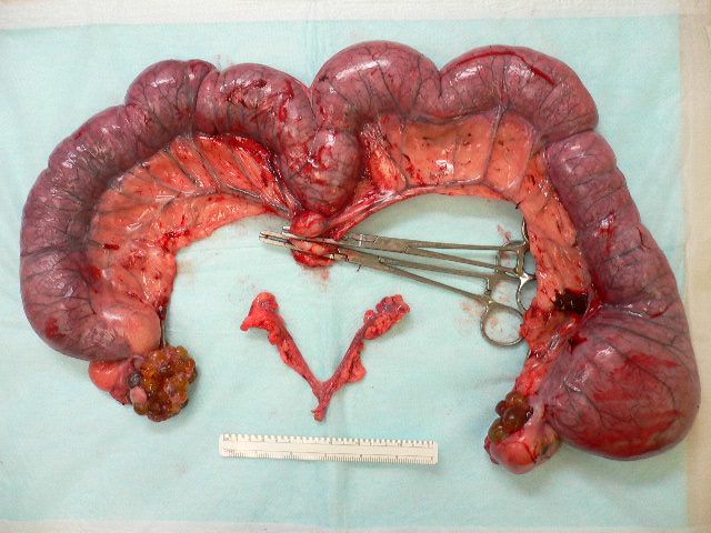 たっぷり膿が詰まった子宮を摘出しました。既に陰部から膿が排出されていましたから、当初は、5kgほど溜まっていたことが想像されます。比較に出している内側の子宮は、ダックスフンドの物すが、これも異常を伴ない少し大きくなっている子宮です。今回の子宮が、いかに大きくなっているかが分かります。