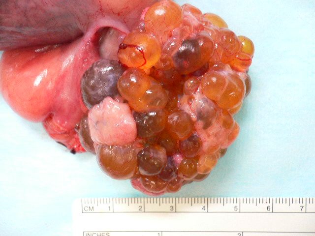 小さな粒粒が寄せ集まった卵巣です。正常では一つの膨らみであり、このようにブドウの房の様に変化することはありません。