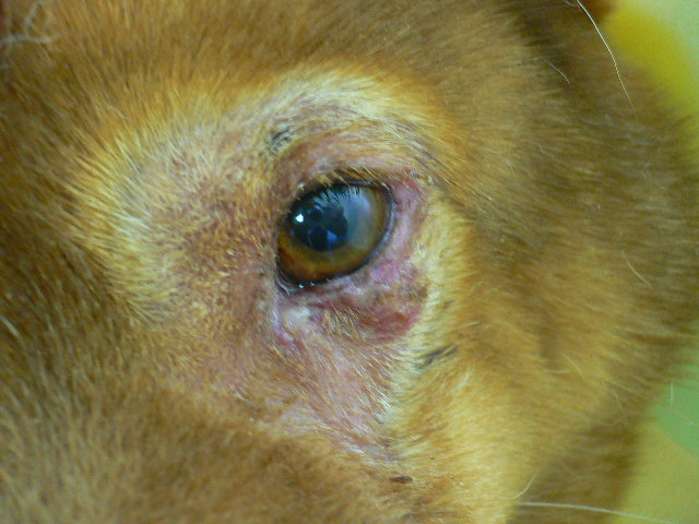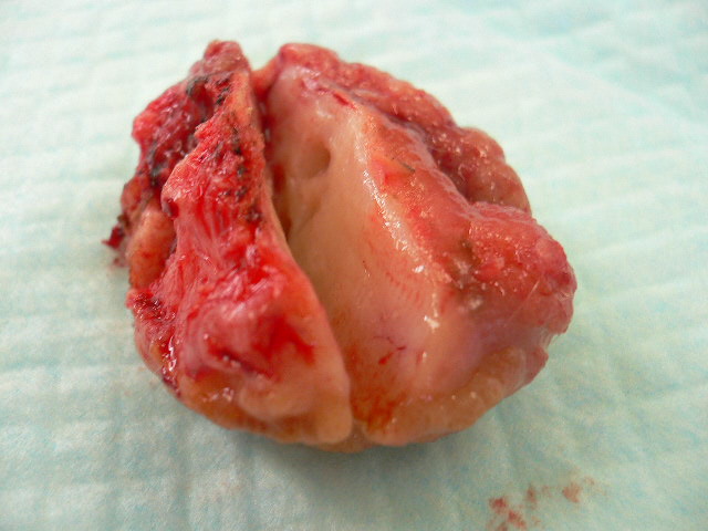 なんでも拾った時から目の縁に小さな固まりがあったそうです。苦節7年、小さかった出来物をこんなに大きく育ててしまいました!?眼瞼の腫瘤は、眼瞼の全長の1/3までであれば、問題なく再建できるのですが、今回は1/3を超えていました。そして、瞼をひっくり返すと、なんか嫌らしい浸潤像があり「この色と言い、裏側のじわっときている感じは悪性ぽいですね〜」とお伝えしました。また、切除が1/3を超えたので、上の瞼を少し切除して、上下のバランスを取りました。(だから少し目が小さくなりました)