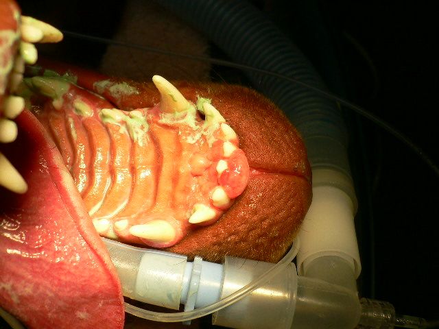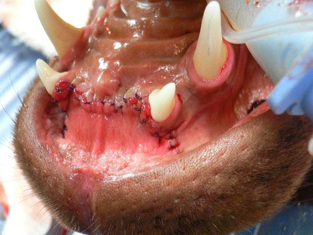 口腔内のフラップをかけて、無事終了。骨にも変化があるので、少し心配です。とっても性格の良い子でした。