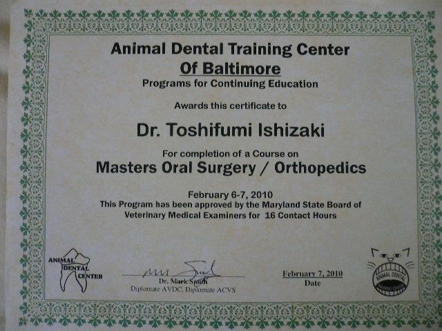 今回も、無事に卒業証書を受け取ることができました。口腔外科の主たる情報を入手することができ、とても有意義な内容でした。日本で待つ飼い主さんへ「一段ステップアップした私に期待ください!See you.」