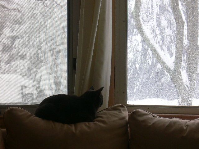 今日も雪。外を眺める猫にも風情があるが、今日も実習の私にとっては、気が重い。「さあ!まずは雪かきからか・・・・。」