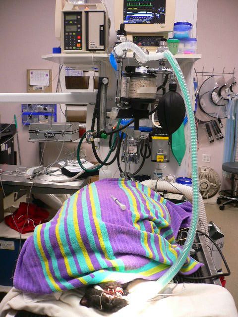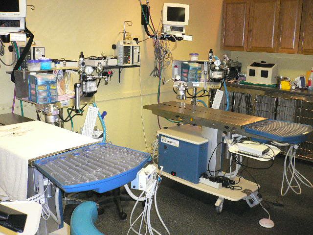 雪の為、患者さんの数は少ないのですが、それでも、他のホームドクターから患者さんが沢山と送られてきます。この猫ちゃんは、以前に取った顎の部分に再度腫瘍が再発した為、2回目の顎の切除を行うところです。この処置台でレントゲン、麻酔、手術が全て行われます。