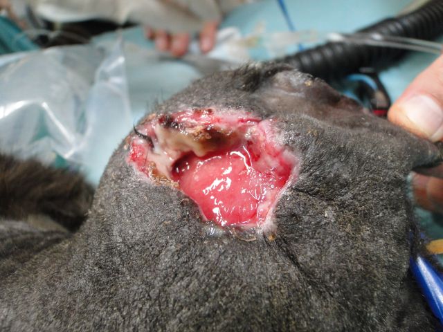 去勢をせずに、外で喧嘩をしまくる雄猫は、物凄ーく顔の皮が厚く、まさに「面の皮が厚く」なります。少々引っかかれたり、噛まれたぐらいでは、歯は奥に穿孔しません。しかし、一旦化膿してしまうと、その分厚い皮膚が仇になり、いつまでも皮膚が破れずに、膿が皮下に溜り込み大変なことになってしまうことがあります。