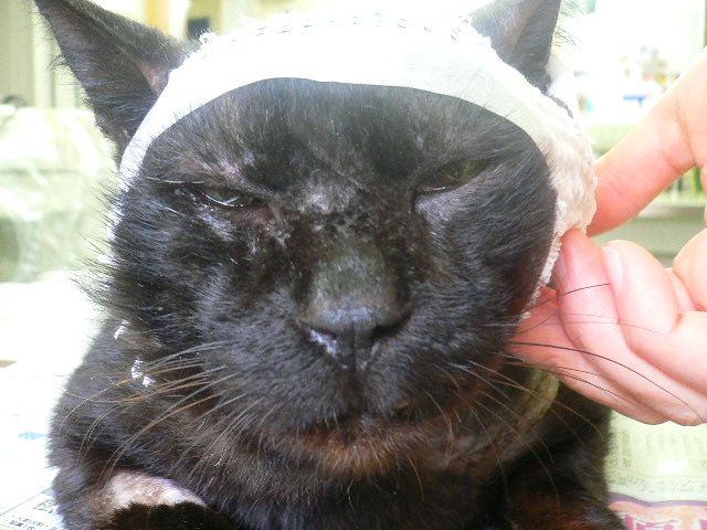 汚い皮を綺麗に切除して縫い合わせました、そして、傷の中に溜る液体を排泄させるチューブも装着しました。このちゃん実は、つい最近まで疥癬(ダニ)に皮膚を犯され、それは、それは、化膿と相まって恐ろしい顔になっていたのでした。ですから、顔の毛はほとんど無くなり、今回の縫合傷により一層人相が悪くなり、迫力を増したのでした。
